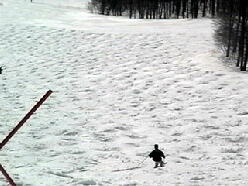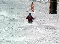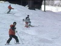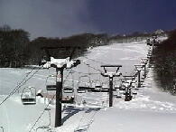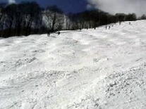 適。8時頃には駐車場に着きました。リフト運行前にセンターハウスで特命記者さんと合流。と りあえずミネロクワッドしか動かないので圧雪バーンに跡を残して遊びましたがしばらくしてミネ ロ第3が動いているので大沢のミネロ側パウダーを食ってきました。フカフカでサイコーです。 何本かミネロ側の大沢を滑った後、ミネロ第4(赤埴)が動きそうなので乗り場付近に陣取り。 久々にアズハタさんにも会いました。 そのアズハタさんが待ちきれなくて大沢に行ってしまって いる11時にようやく動き出しました。パトロールさんが滑った以外はぜーんぶパウダー!!リ フトに乗ったのは十数人目でしたがボーダーがリフト降り場でビンディングをつけている間に誰 も滑っていない軽いdeepなパウダー斜面のド真ん中を特命記者さんとランデブー〜。 滑った後斜面を見ても続々と来るスキーヤー、ボーダーに跡を消されてしまいましたが十分満 足です。あの深雪であの距離を滑ったのはスキー人生で初めてです。大沢も良かったけど比 較になりません!もう一度言います。 2本目からはもう荒地になっていてあまり楽しめませんが、いいです。あの1本で十分です。 午後にはコブが出来てきましたが全然固まってないのと深雪が混ざってとっても難しい。加えて パウダーの滑りすぎで太ももがパンパン。ケガする前にあがりました。 今日は赤埴の1本目に尽きる。しばらく忘れられません。 ましたが、あまりにも大雪すぎてゲレンデ整備が追いついてません。ミネロクワッドが9時半頃 動き出しましたがその他のリフトは動く気配なし。加えてチケット売り場に長蛇の列。あきらめ て1本も滑らず帰ってきました。しかしすんごい雪の量だ!猪苗代周辺が異常に降ったらしい。 ![]() ![]() ウキウキでクワッド乗って降りたら濃霧。あーあ、1本くらい滑らせろよ って感じです。 赤埴は濃霧に加えてとっても寒い!G−SHOCKは−5℃前後をずっと表示してました。風が ほとんど無いのがせめてもの救いです。1時間くらいはコブ3個先が見えない状態が続いてま したがそのうち見えるようになってきました。11時過ぎには雪も削れてきてやっと攻めれるよう に。(でも今日はビデオカメラを背負っていたから控えめに) ラインは4、5本くらいあるでしょう か?やっぱりちょっとピッチが狭い気がするがそんなことは言ってられん! 今日は先シーズ ンも来ていた新潟のカップルに会いました。やっぱり知ってる人がいると一人で滑ってるときと は気持ちが違います。負けられん という気持ちがどうしてもでてしまう。そしてケガする。(今 日は大丈夫だった) 張り切った分太ももが張るのが早く12時半頃にあがりました。 ミネロ第四リフト(赤埴に掛かるリフト)は待ちは無いもののいつもより多めに人がいました。モ ーグルな人は10人くらいいたかな。クワッドは5分位の待ち時間でしょうか。めずらしくミネロの 上の駐車場が9時半頃いっぱいになってました。ポールバーンは今シーズンも作ってありまし た。(1本だけ滑った) 視界不良 帰り道昨日の滑りで全身筋肉痛だけど滑れなくはない。いつもより遅めに出発して9時過ぎに駐車場 に到着。出発した時は晴れてましたが猪苗代周辺は吹雪。1本目にミネロクワッド滑りました が下についた頃にはウェアが真っ白になるくらいの雪が降ってます。 赤埴に行ってみると滑ってるのは10人以下。当然コブは硬い。 雪はずっと降ってるし風も強い。1回滑ってくるともう溝に雪が積もるくらいの大雪です。視界が 非常に悪く3、4個先のコブが見えなかったり視界ゼロになることも... でも軽い雪が適度に溝に積もってくれるし、昨日皆さんがきれいにしてくれたラインで一応快調 に滑れます。雪が降り続いてくれたのが逆に良かったかも?あの天気なら1時間くらいで帰っ たかも知れませんが特命記者さん夫妻とも合流したし、1本ごとにパウダーっぽい雪を滑れた りしたので14時半くらいまで滑りました。赤埴でのラストは太ももがつりそうだった。 センターハウスまでのクワッドのコースにはそこらじゅうに20〜30cmのパウダーが。 そいつを食いまくって本日終了。明日は動けないかも。 車に戻ったら氷の塊になってた。帰り道もゲレンデ同様猛吹雪で3台先が見えないよー。 対向車でライトつけてないのがいっぱいいた。あいつらアホじゃ! 晴れすぎ! 朝一赤埴交差点で曲がれずにしばらく斜めに滑ってしまいました。向こう側にいた車の人ゴメンナサイ。 さて、早めに着いてセンターハウスの自動ドアの前に陣取り、ミネロクワッド、ミネロ第4リフト は一番のり。赤埴滑走も一番のり。最高の雪を期待してたんだけどコブの谷間に30cmくらい のおもーい新雪が...しかもコブはガチガチに硬いです。掘り起こすのに数本。すでに足がパ ンパン。 しばらくして上から下までのラインが発掘されました。疲れました。しかしピッチがせ まいぞ!アイスバーンであのままじゃとても滑れん。今日は気温が上がってよかったけどね