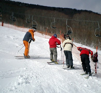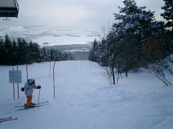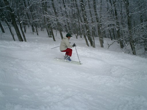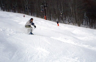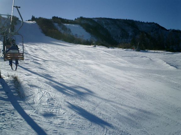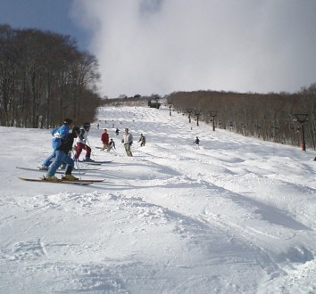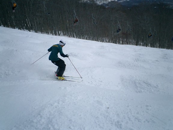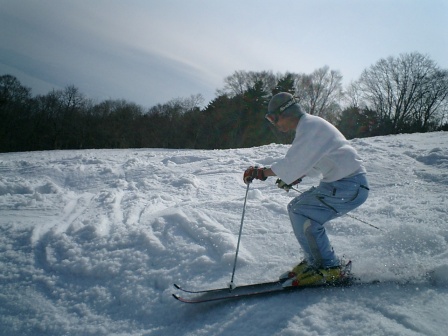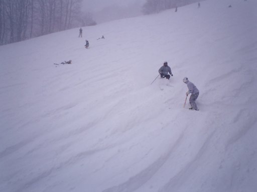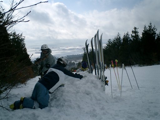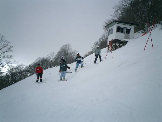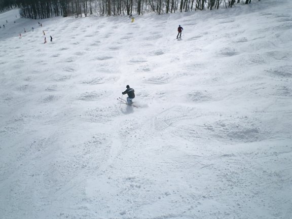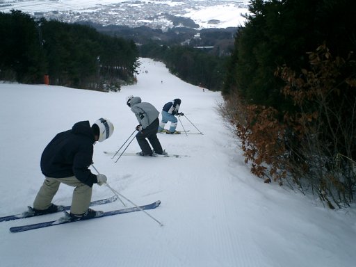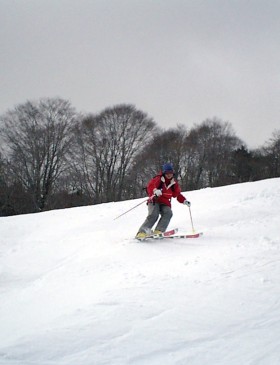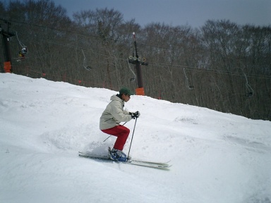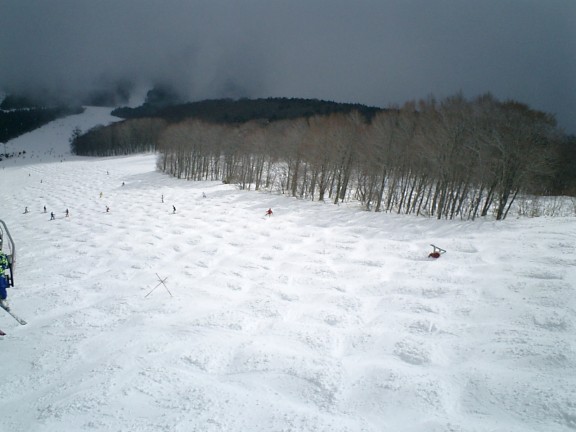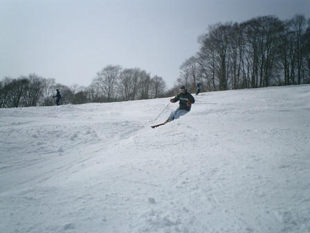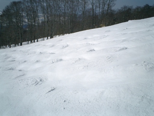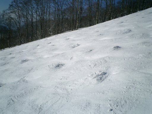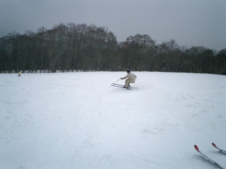 雪。くもっていてとってもさむい!ゴーグルの色が合わず見えない。小さなデコボコがそのまま 固まっていて怖いです。 .と悪いことばかりのようですが、先週できたらしいコブが残ってい てそれを削ってたら特命記者さん、水野さん、そして来れないって言ってた164号+703号さんが登場!!すぐに 滑りやすくなりました。午前中は硬くて跳ね飛ばされてましたが午後からは調子が出てきて2、 3本はうまく滑れたかな?いろいろ考えながら滑りました。今シーズンは考えて滑ろう。5ターン くらいで忘れるけど。
