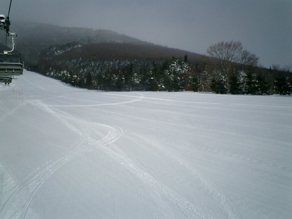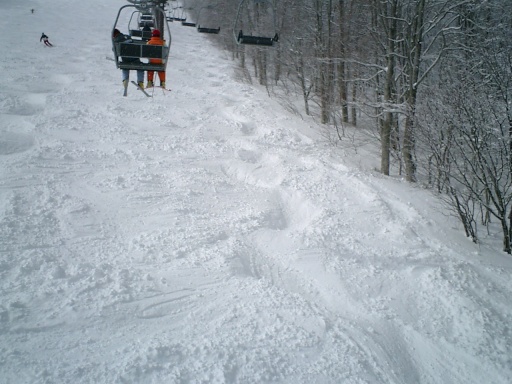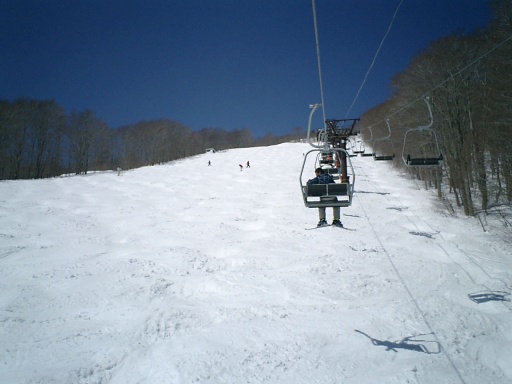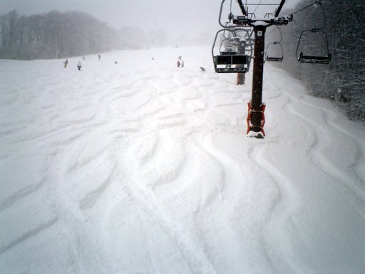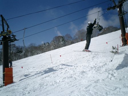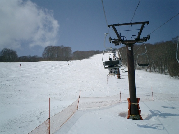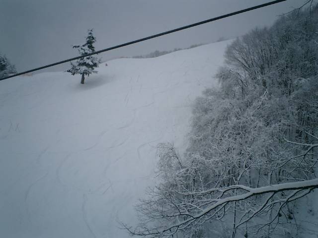 た。(途中の道路は雨)始発のロープウェイにのって上についたらすごい雪が降ってます。リフ トの運行は登山用ということでのろのろ運転。リフトに乗ったのは5番目くらいでしたがゲレンデ を滑ったのは1番目。へっへっへ。圧雪してあるけど雪が柔らかくてすごい跳ね返りでした。2 本目に乗ってふと前を見ると特命記者さん発見。先シーズン3/31ぶり。今シーズンもよろしくお 願いイタシマス。