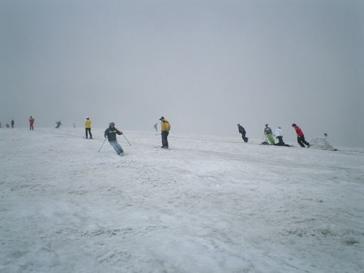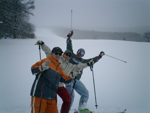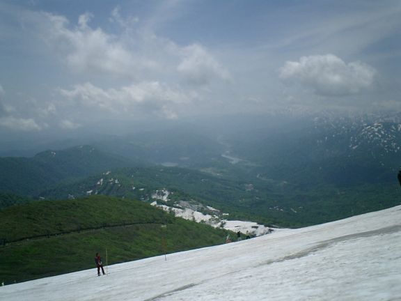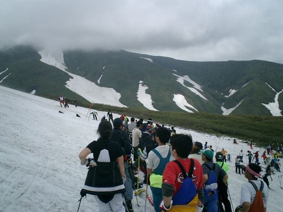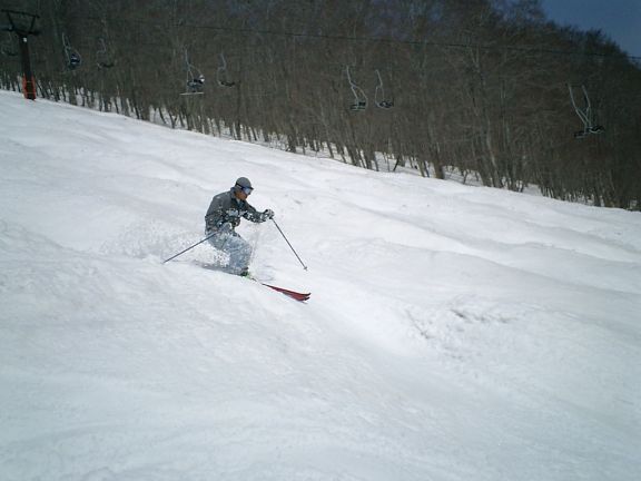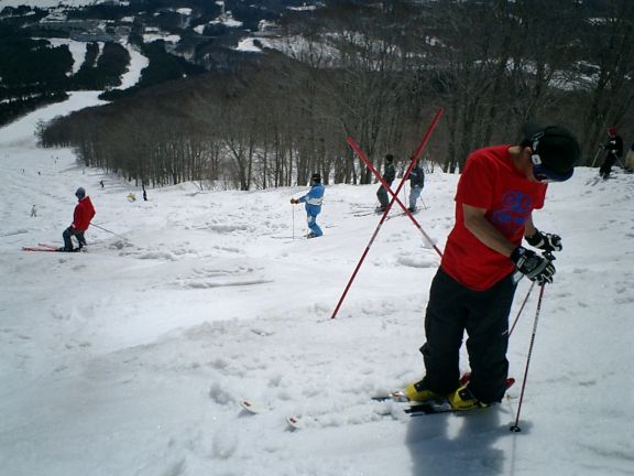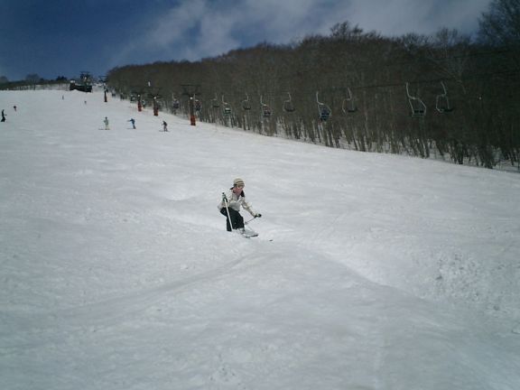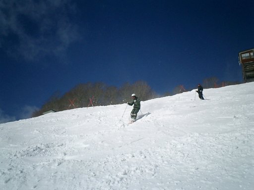 楽しかったなぁ。 忘れて家に戻ってしまう... リステル:ダフィーが滑走可能ということで、猪苗代:赤埴 とどちらに行くか?悩んだ末に赤埴 を選ぶ。 で、センターハウスに入ったら休憩所になんとジョージがいる!(連絡は今回取り合 ってない)スキーバカが富山からやってきた。恐ろしき富山県人会が久しぶりに結成されまし た。前回の県人会で腰を痛めてるので(2003.2.23参照)あまりバカな滑りはやめよう と誓って から滑りだす。まずフラットで足慣らし。ポールバーンが2コースあるのでもちろんデュアルでバ シバシ叩く! 赤埴に入ったがラインは1本。ラインピッチ狭い。人いない、滑りにくい... ということで朝連 カナさんと3人でライン作り始めました。雪が柔らかいので結構早めに出来上がったので一安心。人も次 第に増えてきてアッというまに掘れて来ました。 結構振られるラインになってるのでまっすぐ行くのは難しいかも? 気温もぐんぐん上昇。Tシャツでも暑いくらい。雪は緩みすぎで引っ掛かります。 3月後半のザケザケとは違う感じの雪ですね。難しかったです。 一番下のラインでジョージとデュアルを2本ほどやったけどやっぱ燃えるね! もう少し長いデュアルラインがあったらたのしかっただろうになぁ〜。 今日はたくさんのハニラーがきました。 久しぶりに会ったノヤさん ビンディングの調子が悪かったのかスキー板だけ空中に飛んでた和エドさん マロンさん、まーさん、(あ)さん、大友兄弟、ジュン先輩 等々 記憶力低下のためだれか抜けてるかも? 天気、雰囲気がとてもよくなかなか充実の1日ですた。当然明日筋肉痛予定。 リステルは次の機会にでも。(いつになることやら) に異常だ!)しばらく食べれなくなるかも?な吉牛ねぎだく食べてミネロ入り。 あまりに早く着いたので全身マッサージ機にかかって昇天。あれはいいなぁ〜。 クワッド一番乗りでミネ4も一番乗りかと思ったら、整備中でミネ3、4は9時から運行だそう で... でフラット2本滑ったらもう太ももがパンパンになる。情けない。 ミネ4が動いたのでのってみると、コブが隠れるくらいの積雪があった模様。 一番乗り出来なっかたのでおいしいところはボーダーさんにもってかれましたがそれなりに楽し めた。それにしても今日の雪はフワフワのさらさらのパフパフの...すごーく軽い!! 人出が多くしばらくしたらコブが出てきて狂ったように滑りました。 和製エドぐゎー氏はライン中にエアをかましてましたねぇ。強烈! 昨日まで熱出してた特命記者さんも滑ってます。 他、たくさんの人が集まり一緒に滑りました。 エア台も整備して、今シーズン初めて飛んでみた。ボージャン1回、ツイツイを2回。ツイは90 度回んなかった。まぁ久しぶりだったからな、ということで。 みなさんのエア、楽しかったですよ。 雪がいいので突っ込んでいける分スピードが上がる上がる!もうフォームなんか気にしないぞ ー といった感じです。きっとこの調子じゃ午前中で足が終わってしまうだろうと話してたらやっ ぱり12時にはツリマシタ。 ミネロウエストを下ってる時に、ももが痙攣して端っこでもがいてたのは私です。 ところが滑り始めると快晴になり、あっという間にトレーナー姿でOKとなりました。 赤埴にはいつものところにエア台があり、ボージャンを2回ほどしたけど前に飛んでいくような 台だったため、大友工作員+αが整備してくれました。 さて、久々にエアやろうかなと出来上がりを見たらとってもナイスな台になっています。そびえた つ壁のようです。怪我がイヤなので飛ぶのはやめました。きっとそれで正解です。トリプルが軽 くできるくらいの台でしょう。 そんなエア台で大友兄弟はアイアンクロスヘリ、バックフリップ(ちょっと軸をずらしてるから違う 名前がついてるんだと思う)をキレイに決めてギャラリーから歓声を浴びていました。 そのうちチームリステラーの若者が続々と現れ注目の的になってました。あーカッコいいなぁ。 今日の自分はうまく滑れず、とても疲れました。 メット脱ぐたびに湯気が上がるのを見て一人笑ってました...(アヤシイ) たくさんの人が集まり楽しかったですが、写真イイのがほとんどとれてませんでした...
