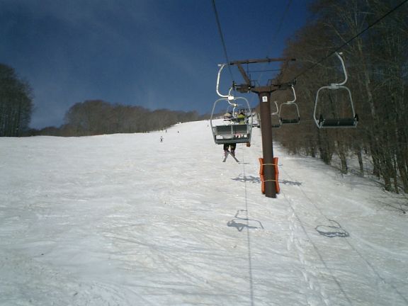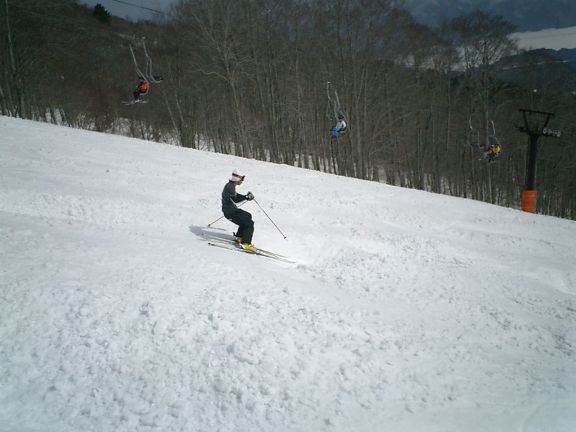 窪ダムをドリフトで攻めて(ウソ)目が覚めた。7時40分頃駐車場に到着、すぐ特命記者さんを 発見。私は車でしばらく休んでからロープウェイへ。上の駅についてゆっくり準備してさあ滑ろう としたら、ゴーグルが無い!車においてきた...仕方なく一人でロープウェイにのって取りに行 きました。 やっとスキーをはこうとビンディングに書いてあるRを見て、ライトだから左だな と 左右逆にはいてしまう。 頭がはたらいてない模様。